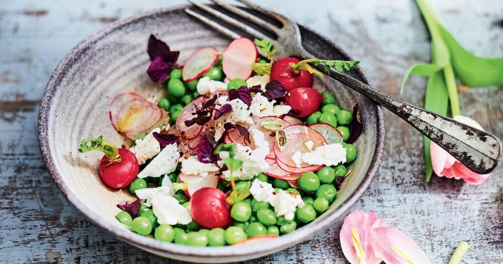 - Préparation : Blanchissez les petits pois, tranchez finement les radis et mélangez avec la feta émiettée. Ajoutez quelques feuilles de menthe et assaisonnez avec une vinaigrette légère au balsamique.