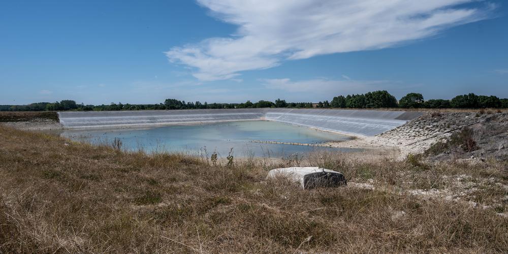 ILLUSTRATION SECHERESSE CANICULE CHALEUR AGRICULTURE IRRIGATION Une réserve bas­sine d’eau de sub­sti­tu­tion dont le niveau est au plus bas. Nuail­lé-sur-Bou­tonne, le 08 08 2022