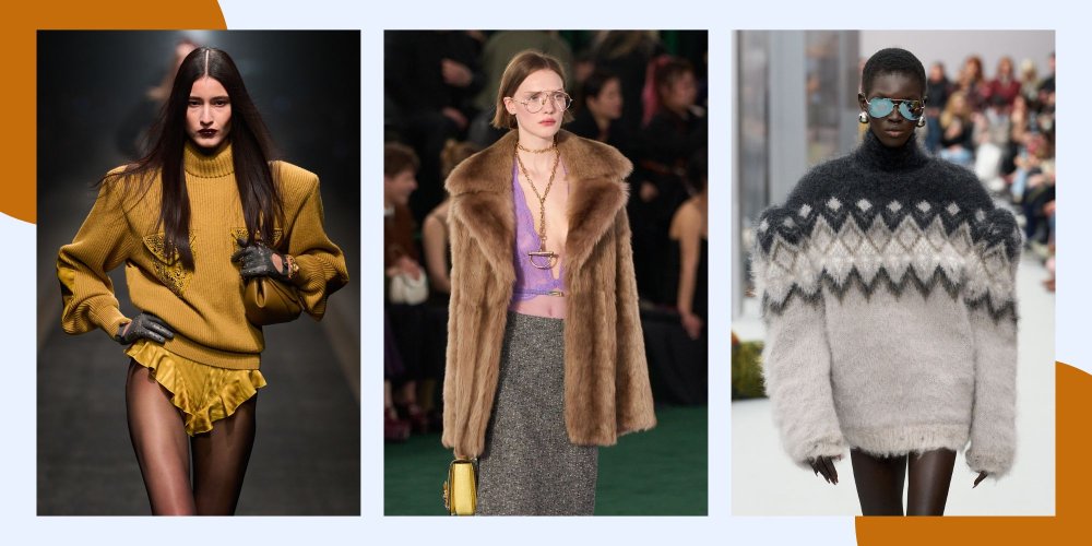 Les sacs à franges, les cein­tures larges, les lunettes de soleil néon, les bijoux imposants et les cha­peaux over­size com­plè­tent les sil­hou­ettes. Les cardi­gans chauds et doux, les pulls doudou et les super­po­si­tions de matières appor­tent con­fort et chaleur, sans sac­ri­fi­er le style267.
