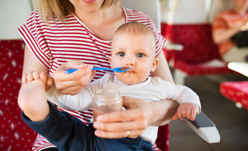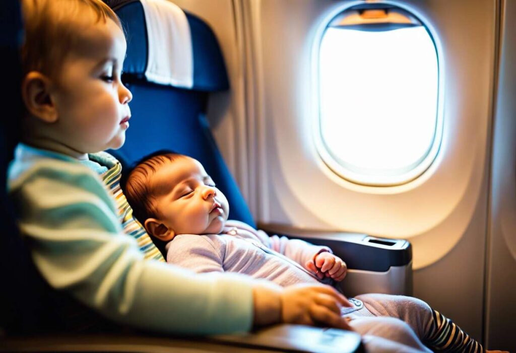Réservez si possible des places adaptées (espace famille, berceau), prévoyez de quoi occuper et nourrir bébé. Pour l’avion, faites téter ou donnez une tétine au décollage et à l’atterrissage pour éviter les douleurs d’oreille.