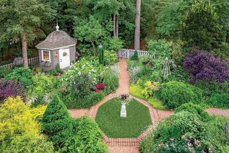 - Éléments romantiques : gloriettes, bancs en fer forgé, petits ponts de bois.